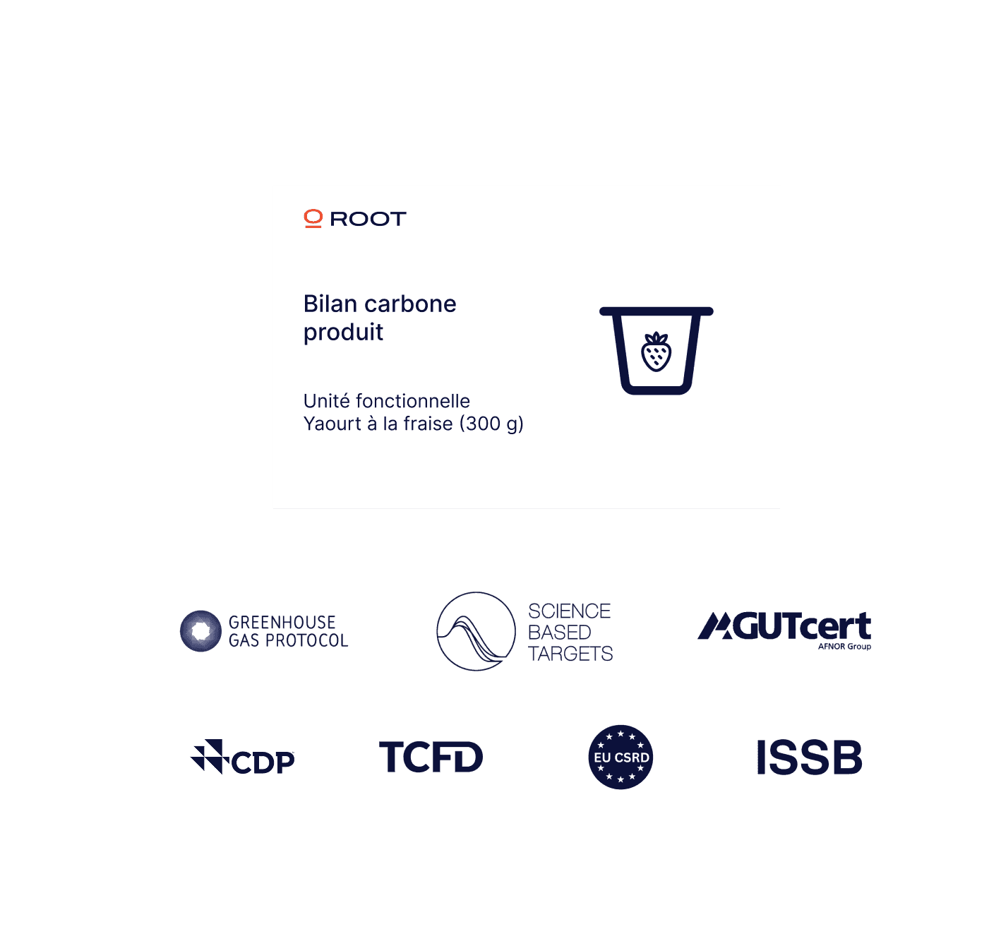 Nous suivons le protocole GHG et toutes les normes sectorielles pertinentes telles que l'IDF, et nos résultats de bilan carbone produit sont certifiés par GUTcert selon la norme ISO 14064-3. Nous fournissons des rapports récapitulatifs qui peuvent être partagés avec vos clients et des rapports plus détaillés pour un usage interne. Lorsque disponible, Root intègre également des facteurs d'émission pour les matières premières basés sur des données d'émissions validées au niveau des exploitations.